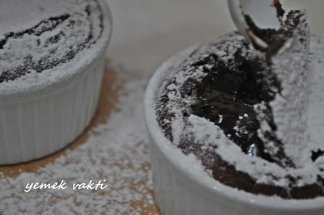 Bu sufle altı ve üstü kıtır kek ortası akışkan ama asla yumurta kokmayan bir sufle...Ayrıca itiraf etmem gerekirse vakit darlığında yumurta aklarını ayrı çırpma işini es geçerek bütün yumurtaya 1 yemek kaşığı şeker ekleyip iyice çırpıp un ilave ediyorum.En son tereyağ ile erimiş benmari usulü çikolatayı ekleyip sufle kaplarına öyle paylaştırıyorum.....